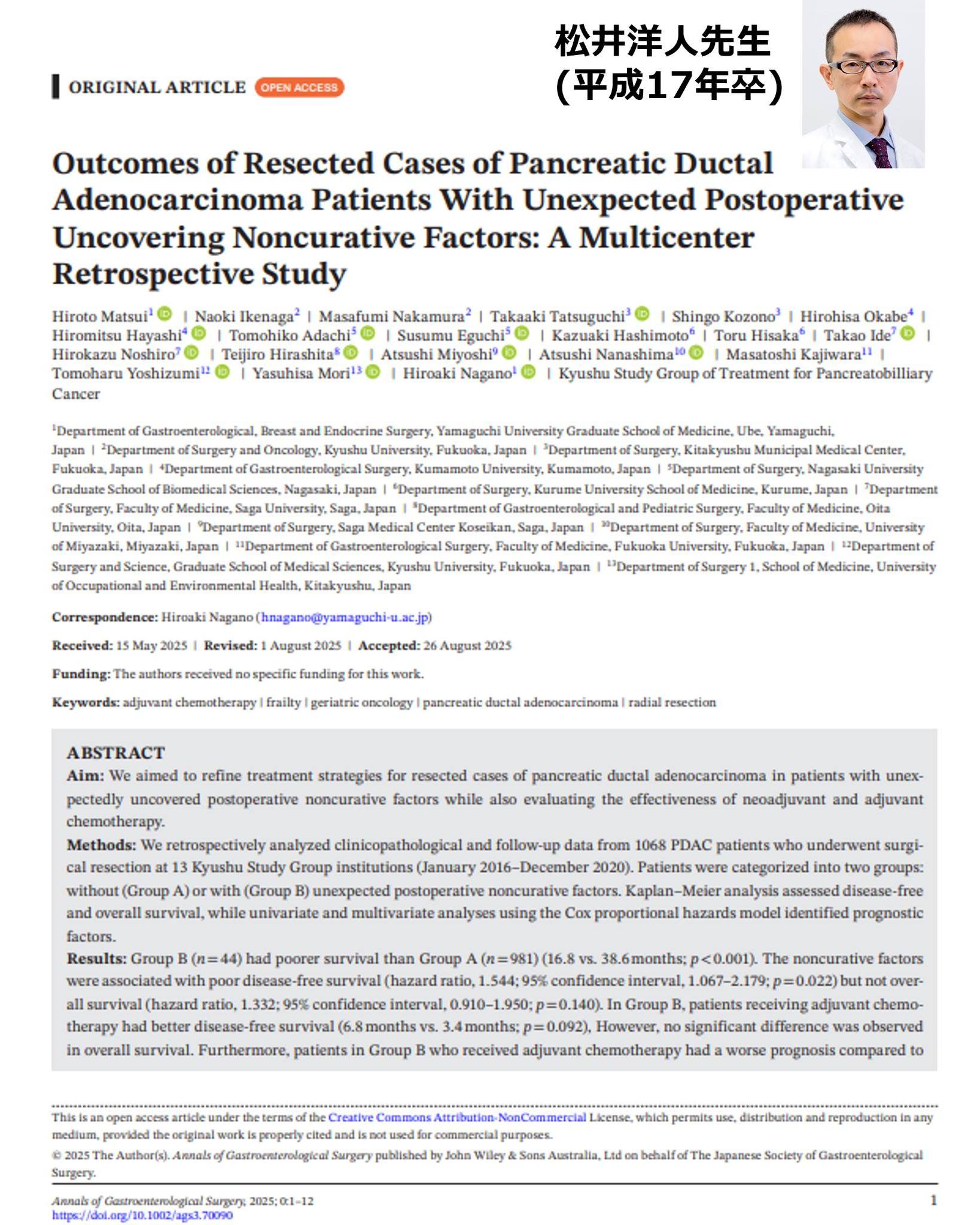 教室の助教 松井 洋人(平成17年卒)が第一著者の、九州胆・膵治療研究会による多施設共同臨床研究がAnnals of Gastroenterological Surgery誌に採択されました。