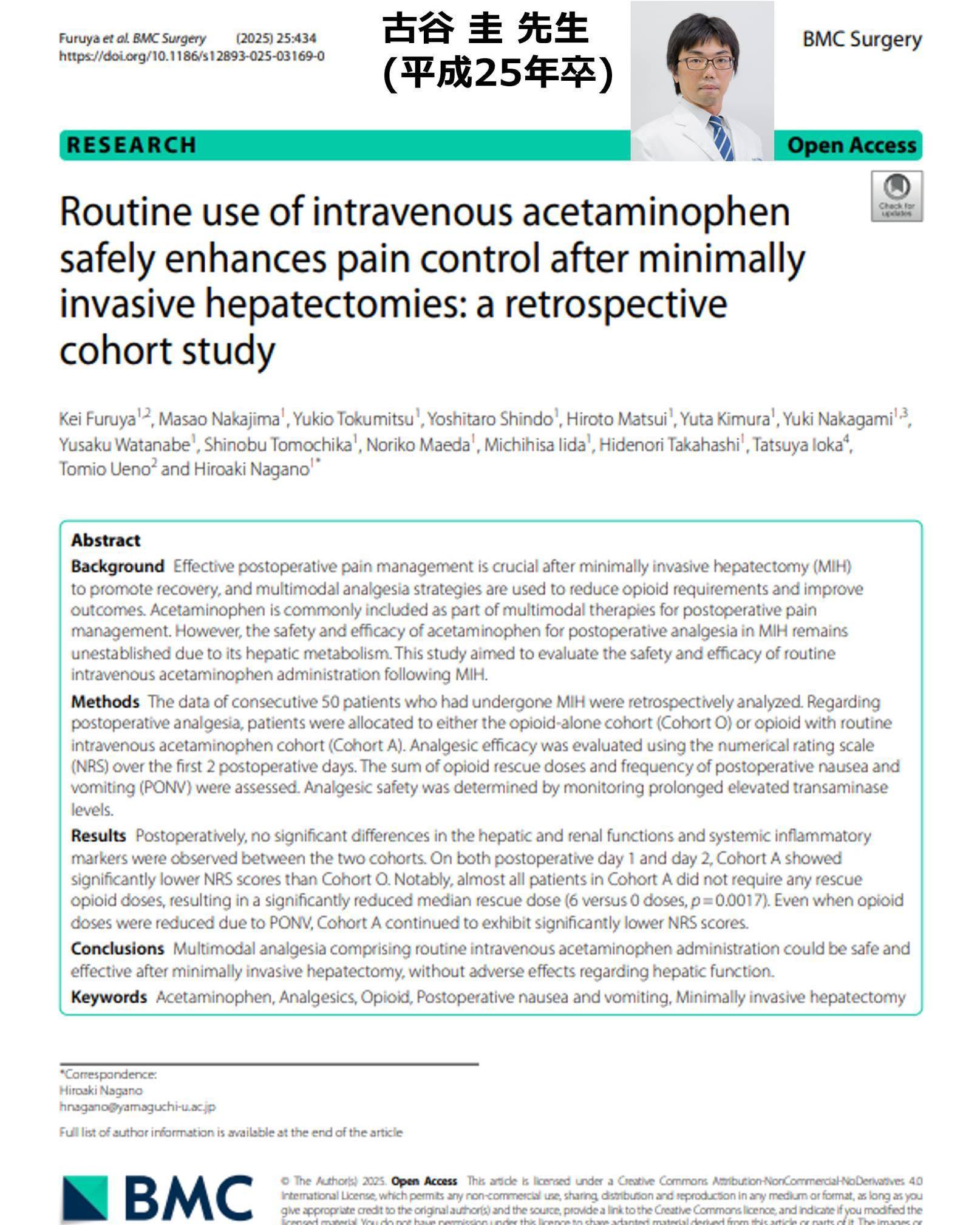 教室の古谷 圭(平成25年卒)が第一著者の、「Routine use of intravenous acetaminophen safely enhances pain control after minimally invasive hepatectomies: a retrospective cohort study」がBMC Surgery誌に採択されました。