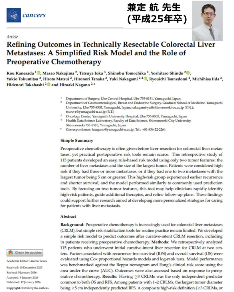 教室の兼定 航(平成25年卒)が第一著者の、”Refining Outcomes in Technically Resectable Colorectal Liver Metastases: A Simplified Risk Model and the Role of Preoperative Chemotherapy”がCancers誌に採択されました。